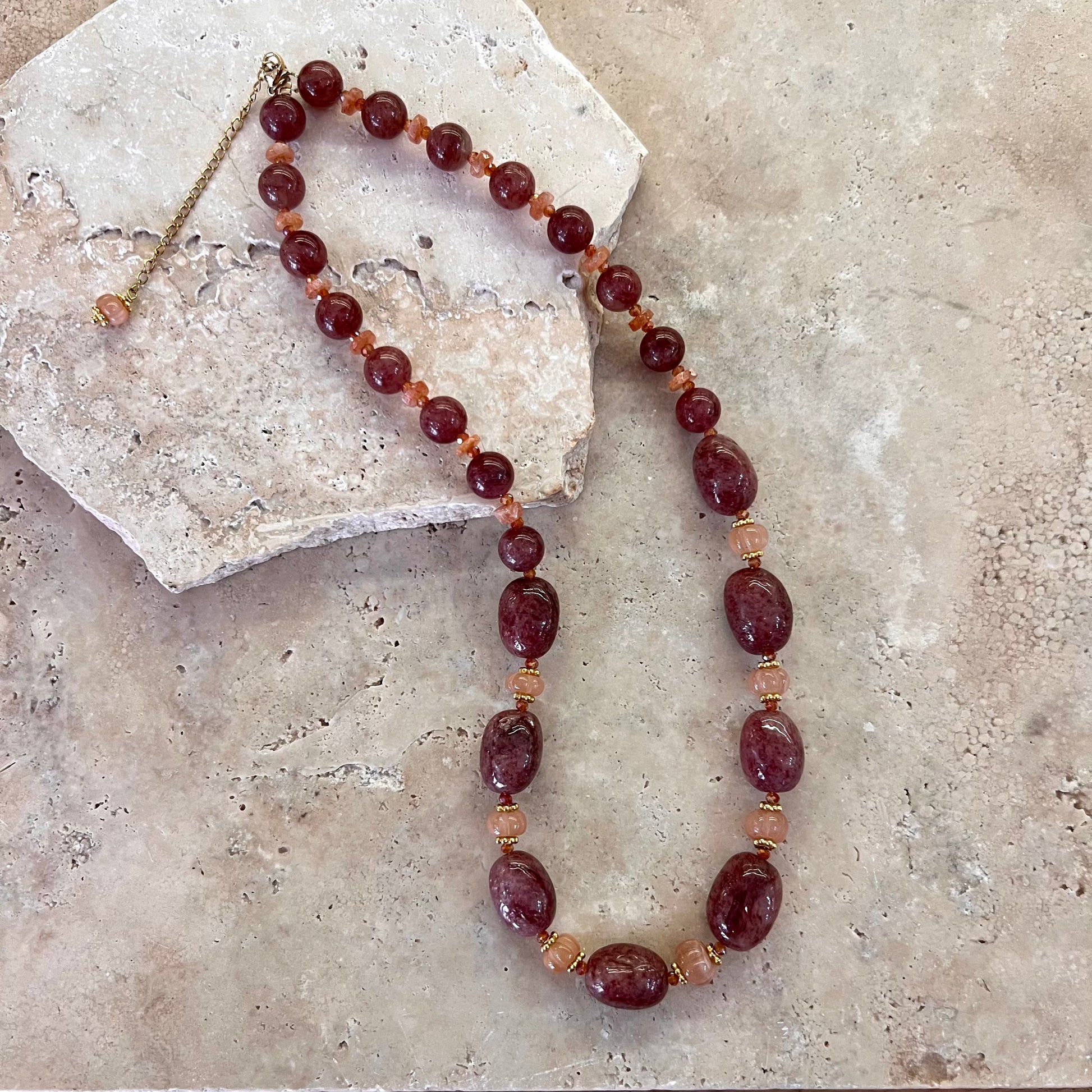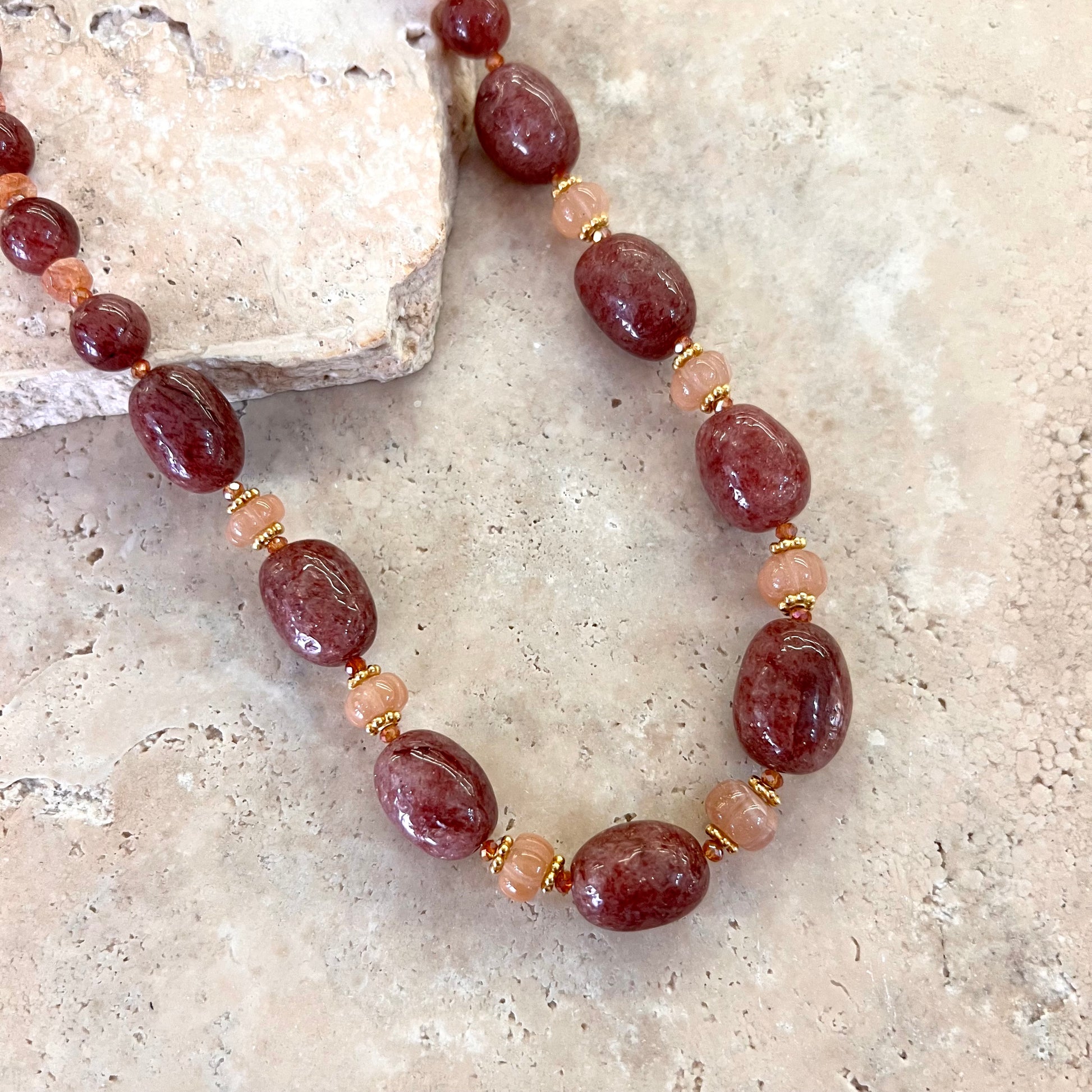 Collier en quartz framboise et pierre de lune pêche, entièrement monté à la main. Les perles ovales révèlent des nuances vibrantes, mises en valeur par des intercalaires dorés qui apportent relief et lumière.