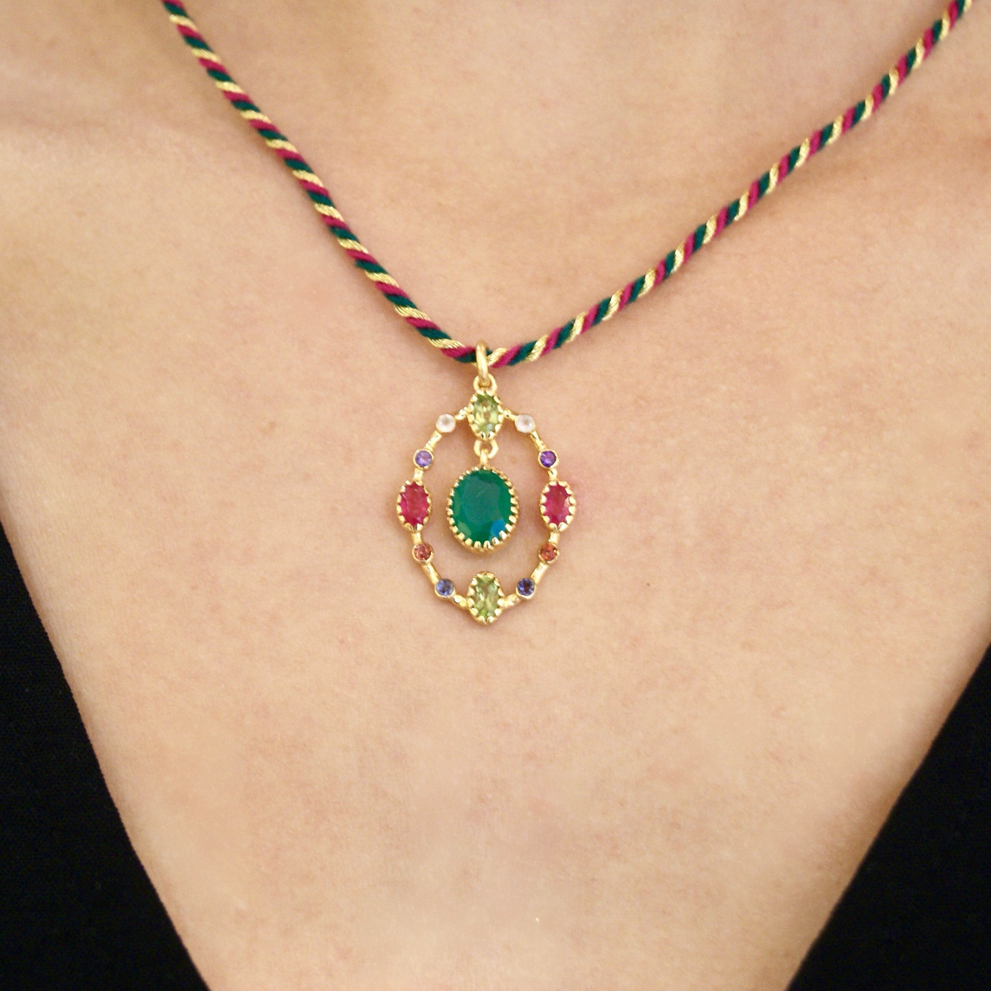 Le collier Goa onyx vert incarne l’élégance solaire et la richesse artisanale chère à Mademoiselle Azalée. Réalisé à la main dans notre atelier, il marie la profondeur de l’onyx vert à un camaïeu de pierres fines aux teintes éclatantes : péridot, améthyste et grenat.