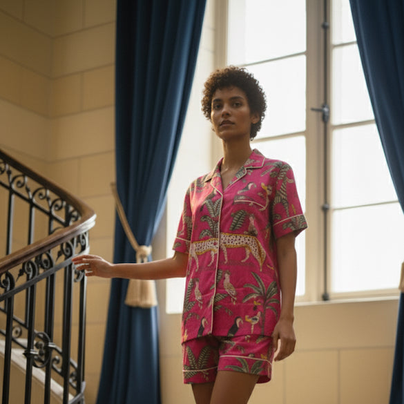 Pyjama court Jungle Pink - Mademoiselle Azalée, 100% coton, block print indien