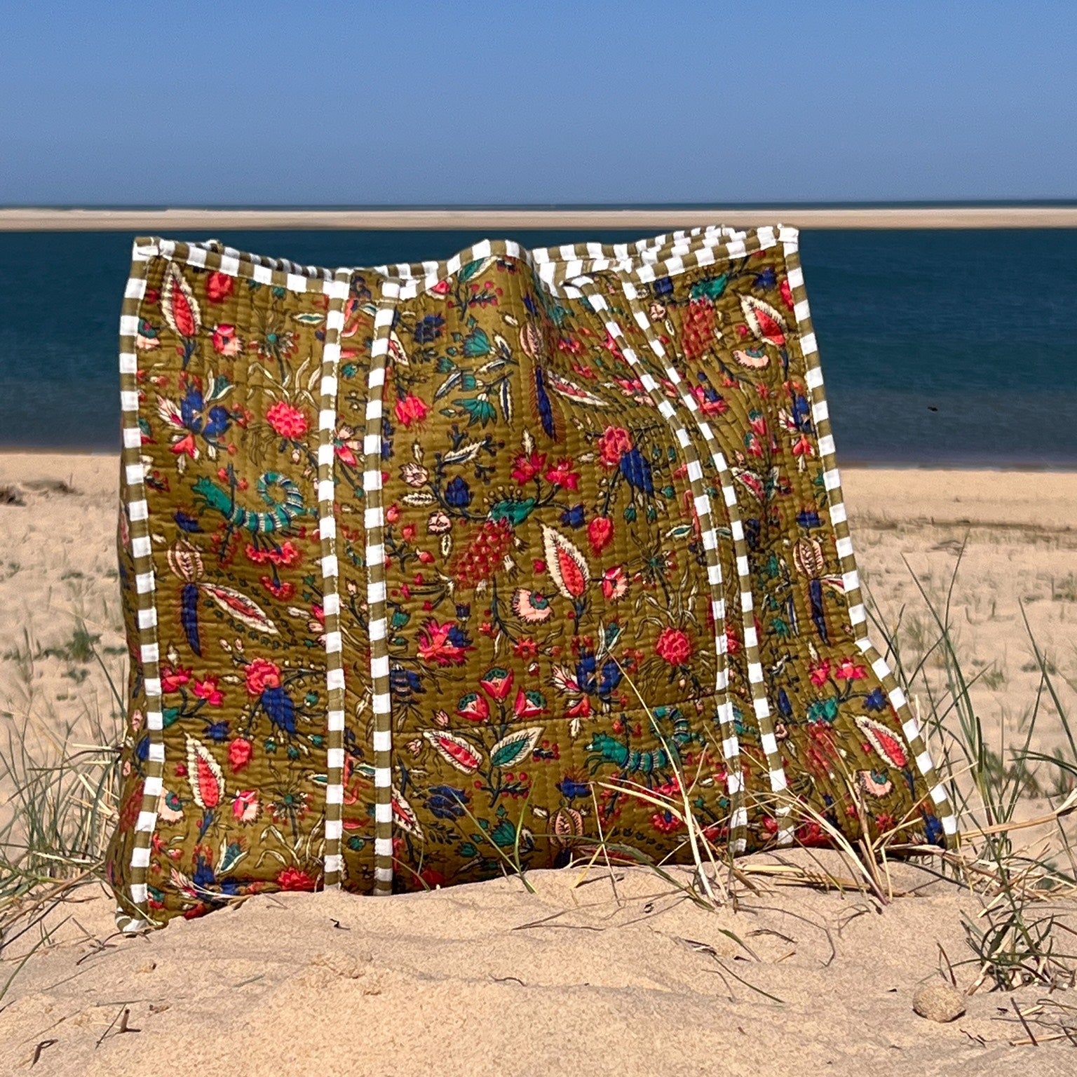 Création originale de Mademoiselle Azalée à Agen, ce sac en 100% coton matelassé associe confort et élégance. Inspiré du block print indien, il présente un imprimé fleuri raffiné sur fond kaki, avec une face réversible à rayures, idéale pour varier les styles.