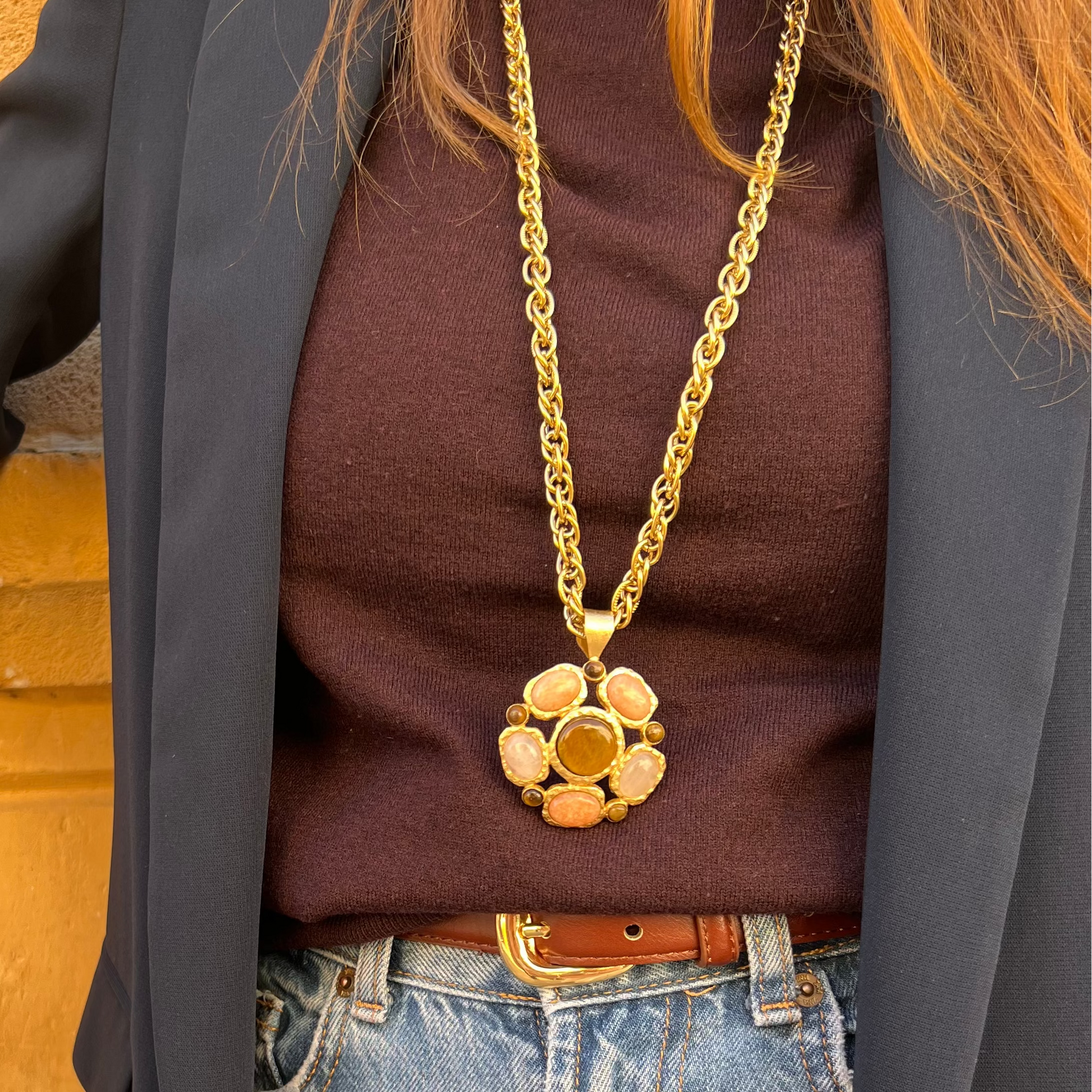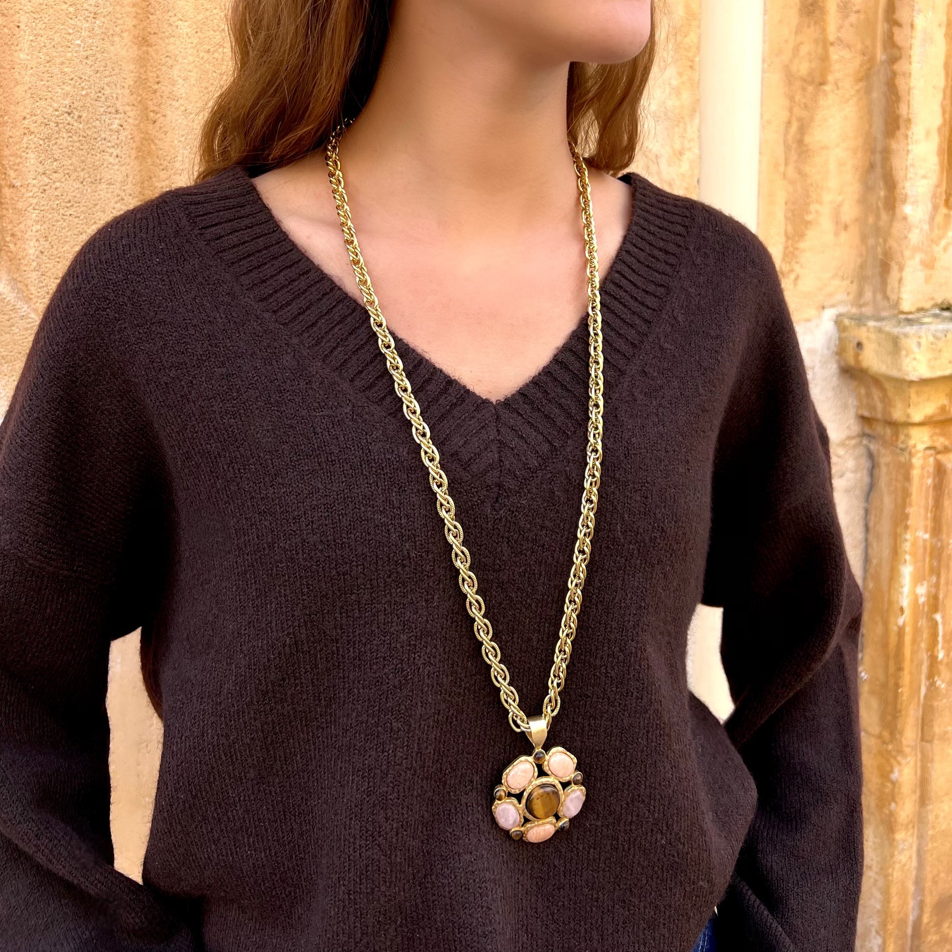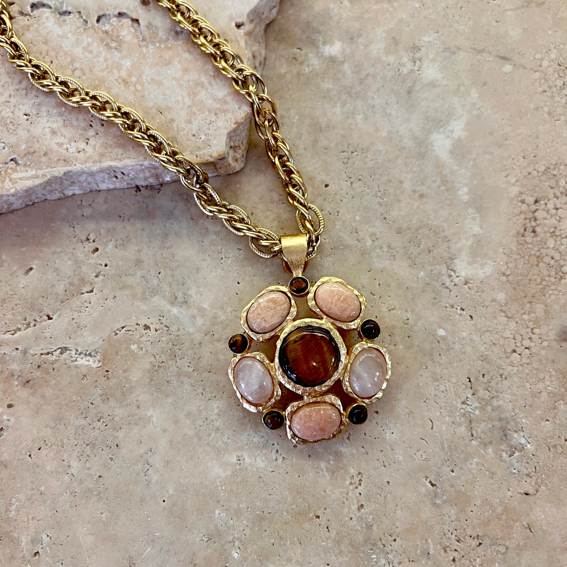 Monté sur une chaîne dorée à l’or fin 24 carats, son pendentif ovale est orné de pierres naturelles de quartz rose et d’œil de tigre, alliant tendresse et caractère.