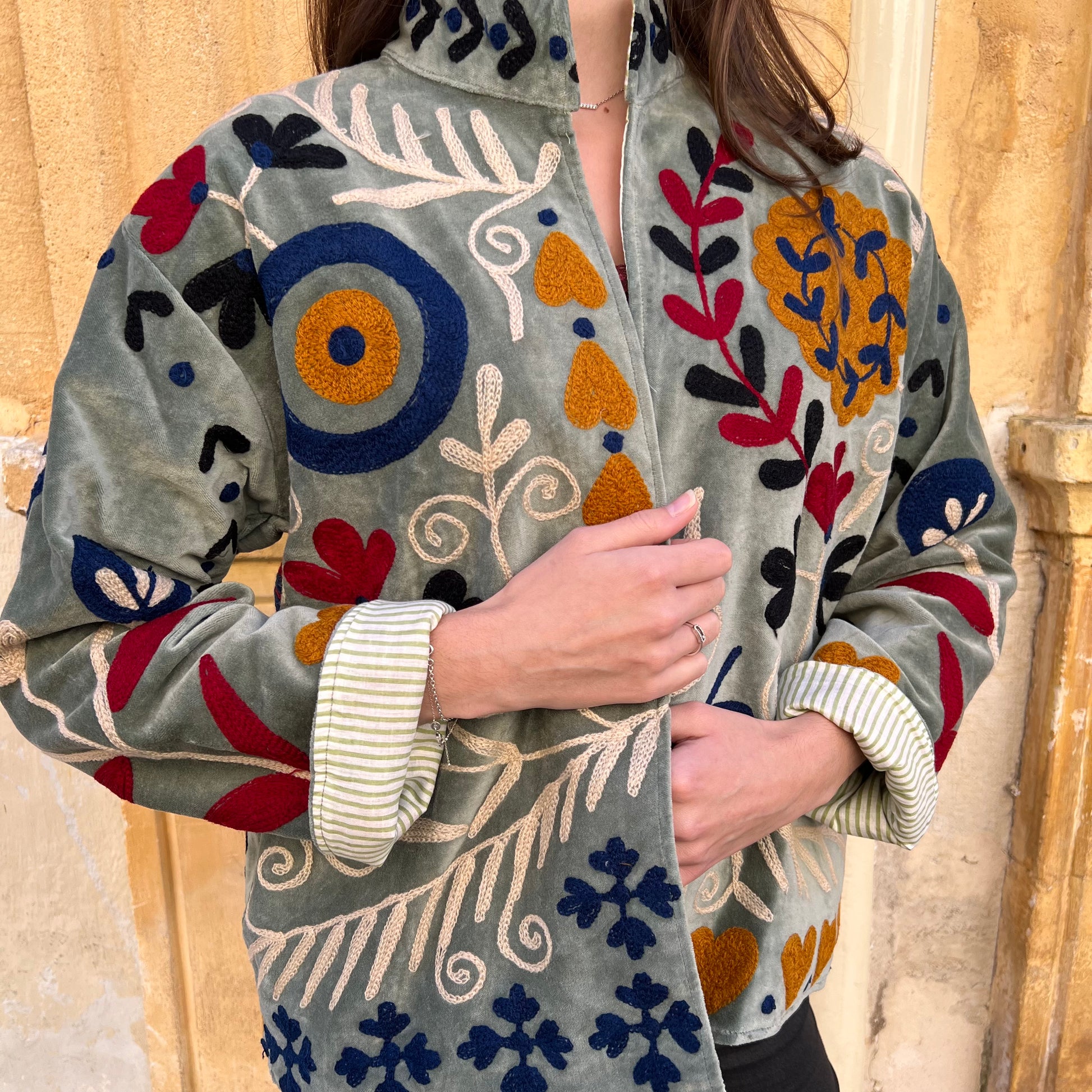 Élégante et pleine de douceur, la veste Suzane vert amande signée Mademoiselle Azalée allie la richesse du velours à la délicatesse des imprimés indiens.