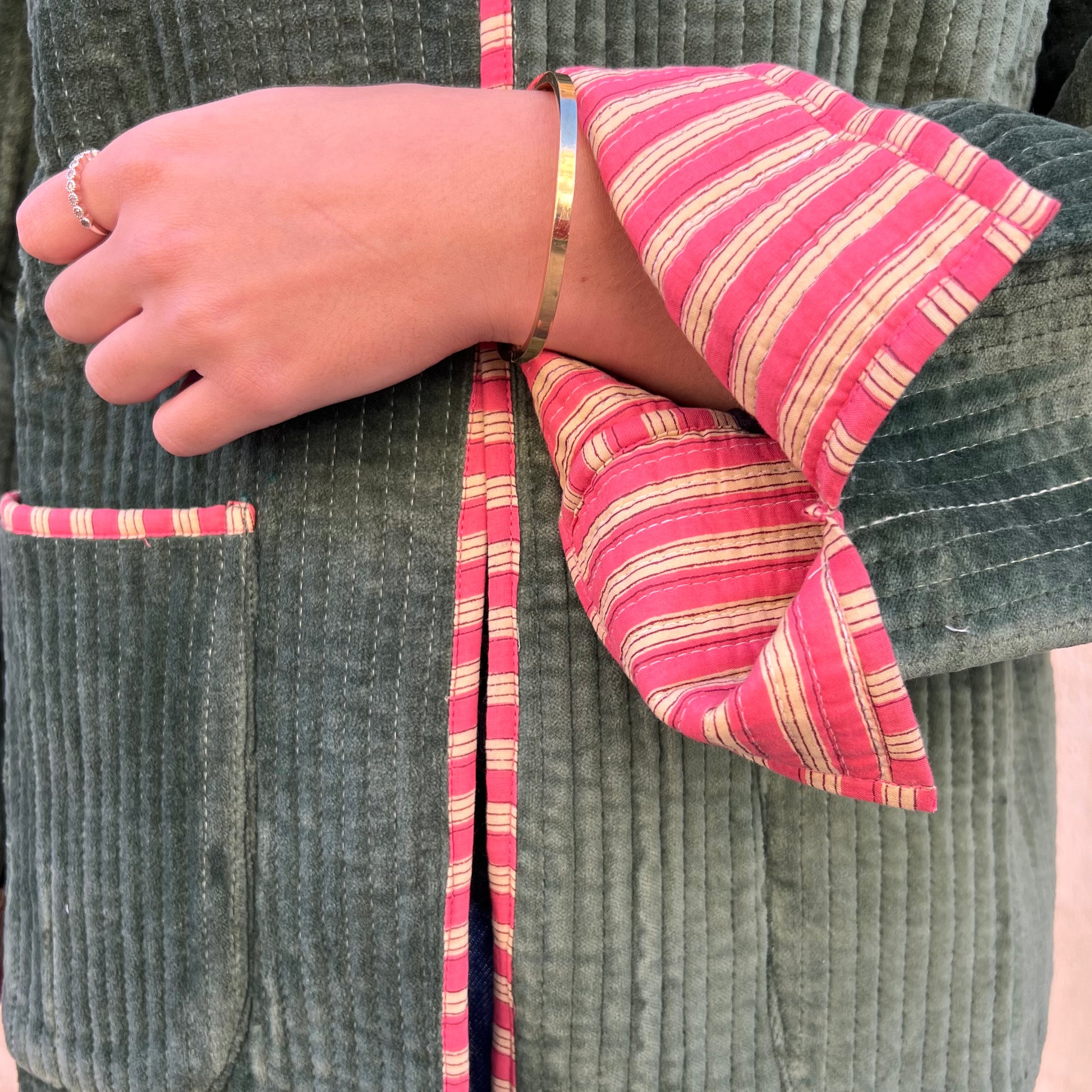 Chic et naturelle, la veste Velvet kaki signée Mademoiselle Azalée marie la douceur du velours à la richesse des imprimés indiens.